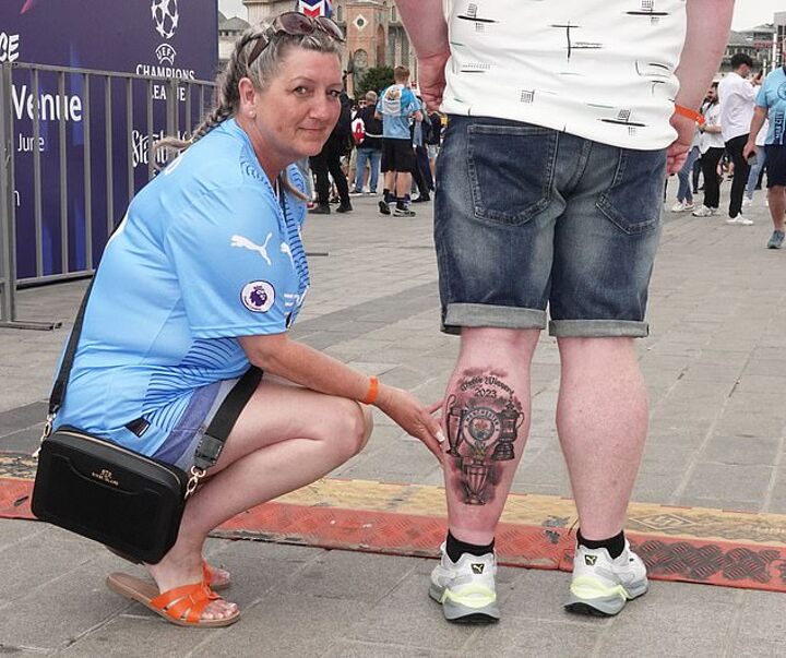Confident Bryan proudly showed off a fresh tattoo on his leg that read 'Treble winners' with a picture of the Premier League trophy, FA Cup and Champions League and the year 2023.