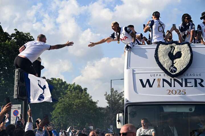 Fans lined the route, waving flags and chanting, as manager Ange Postecoglou and captain Son Heung-min proudly displayed the Europa League trophy atop the bus.