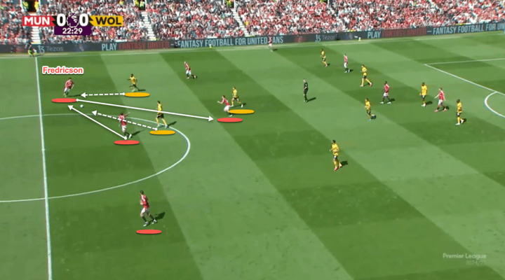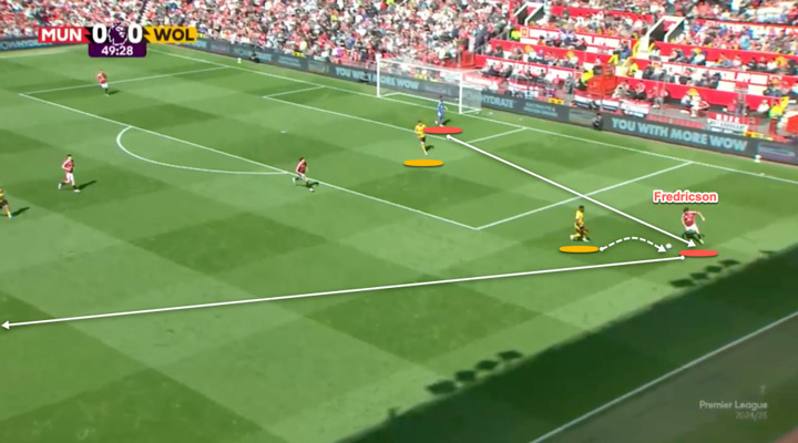 Combative and committed against the ball in the defensive phase it is also notable that Fredricson has the ability to progress the ball and play forward passes, something that is missing around United’s other central defenders.
