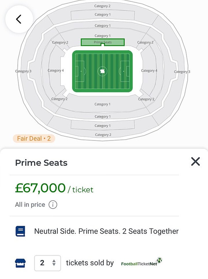 One resale website, footballticketnet.com, is offering ‘prime seats’ for the clash between Real Madrid and Borussia Dortmund for £50,000 plus a £17,000 booking fee. Another unauthorised reseller, livefootballtickets.com, is selling ‘Skybox’ hospitality tickets for an overall price of £34,255.