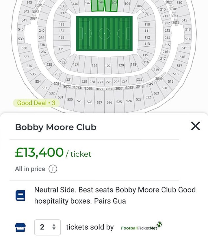 On the same site, some non-hospitality tickets are going for as much as £5,025 once the fee is included, almost 35 times the face value of a £145 category one seat.