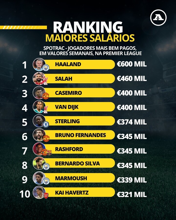 On October 13, "A Bola" listed the top ten highest-paid players in the Premier League in terms of weekly salary.