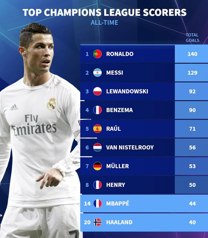 Ronaldo is the top scorer of the Champions League with 140 goals, 11 goals more than Messi.