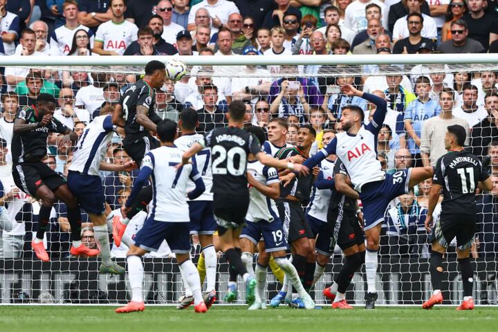 After the corner was taken short, Micky van de Ven’s header was kept out by a diving Raya.
