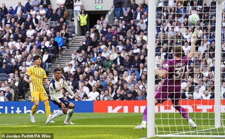 But then, finally, Spurs gave their fans something to cheer. Xavi Simons got the ball on the edge of the Brighton box, turned and floated a delicate chip into the box. Verbruggen came for it but Pedro Porro got to it ahead of him and nodded it into the empty net.