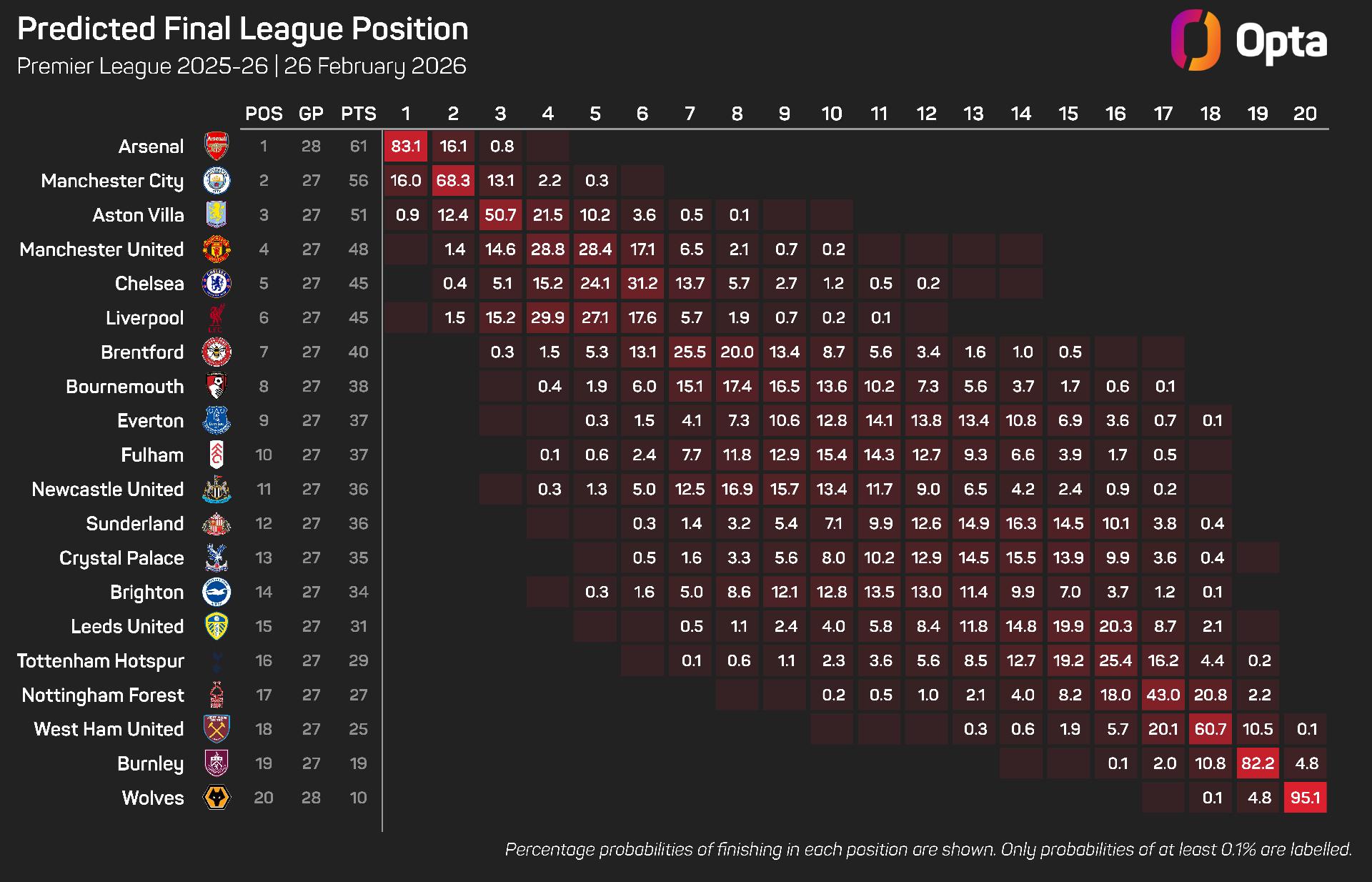 The Opta supercomputer is only giving Spurs a 4.6% chance of being relegated to the Championship.