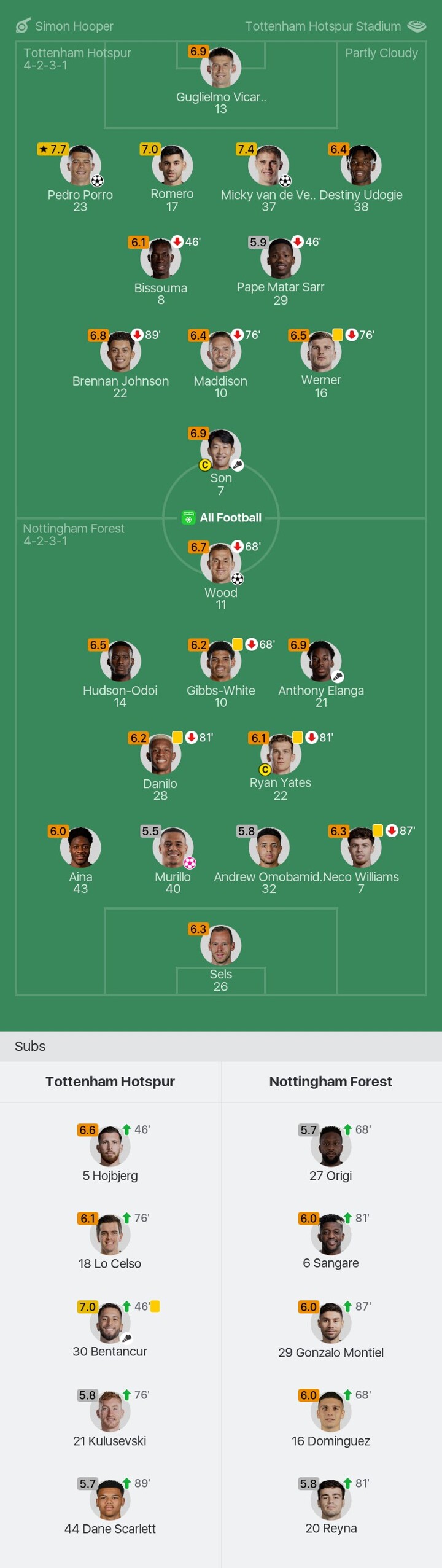 We bring you the player ratings for Tottenham Hotspur vs Nottingham Forest as Pedro Porro becomes Man of the Match with a rating of 7.7.