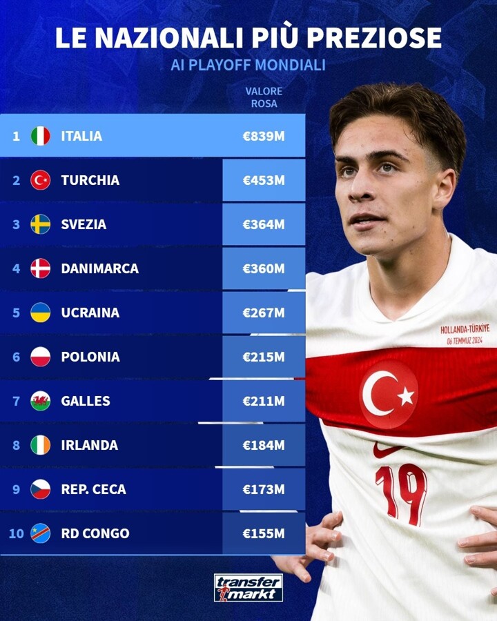Transfermarkt listed the value rankings of the teams participating in the World Cup play-offs.