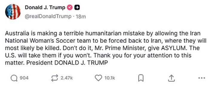 Trump wrote on social media: 'Australia is making a terrible humanitarian mistake by allowing the Iran National Woman's (sic) Soccer team to be forced back to Iran, where they will most likely be killed.