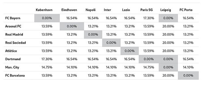 City also have a 14.75 per cent probability of drawing FC Copenhagen, who advanced out of Group A along with Bayern Munich, while Manchester United and Galatasaray both failing to qualify.