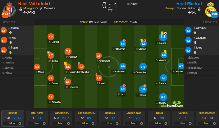 NACHO’S DIPPING HEADER PUTS MADRID IN THE LEAD! Kroos’ corner is beaten away by a Valladolid head, but it’s delivered back to the midfielder, whose second effort finds the head of his right-back at the edge of the six-yard box! It's a nifty finish into the back post - evading centre-back and goalkeeper in the process!