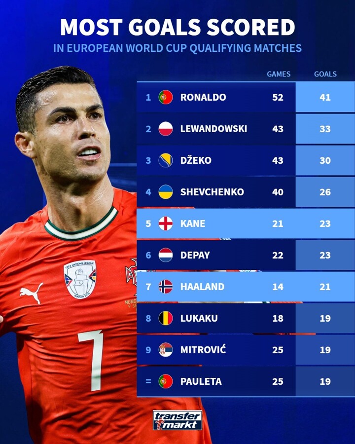The German transfer markt website has compiled a list of the all-time top scorers in European World Cup qualifiers. Cristiano Ronaldo leads the rankings with 41 goals, Harry Kane is fifth with 23 goals, and Erling Haaland is seventh with 21 goals.