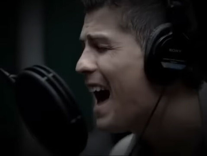 It shows the 39-year-old sat in a music studio singing to the best of his ability as a dramatic backing track plays behind him.