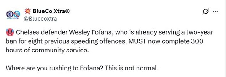 Fofana was also previously disqualified for six months in January 2023 for speeding offences.