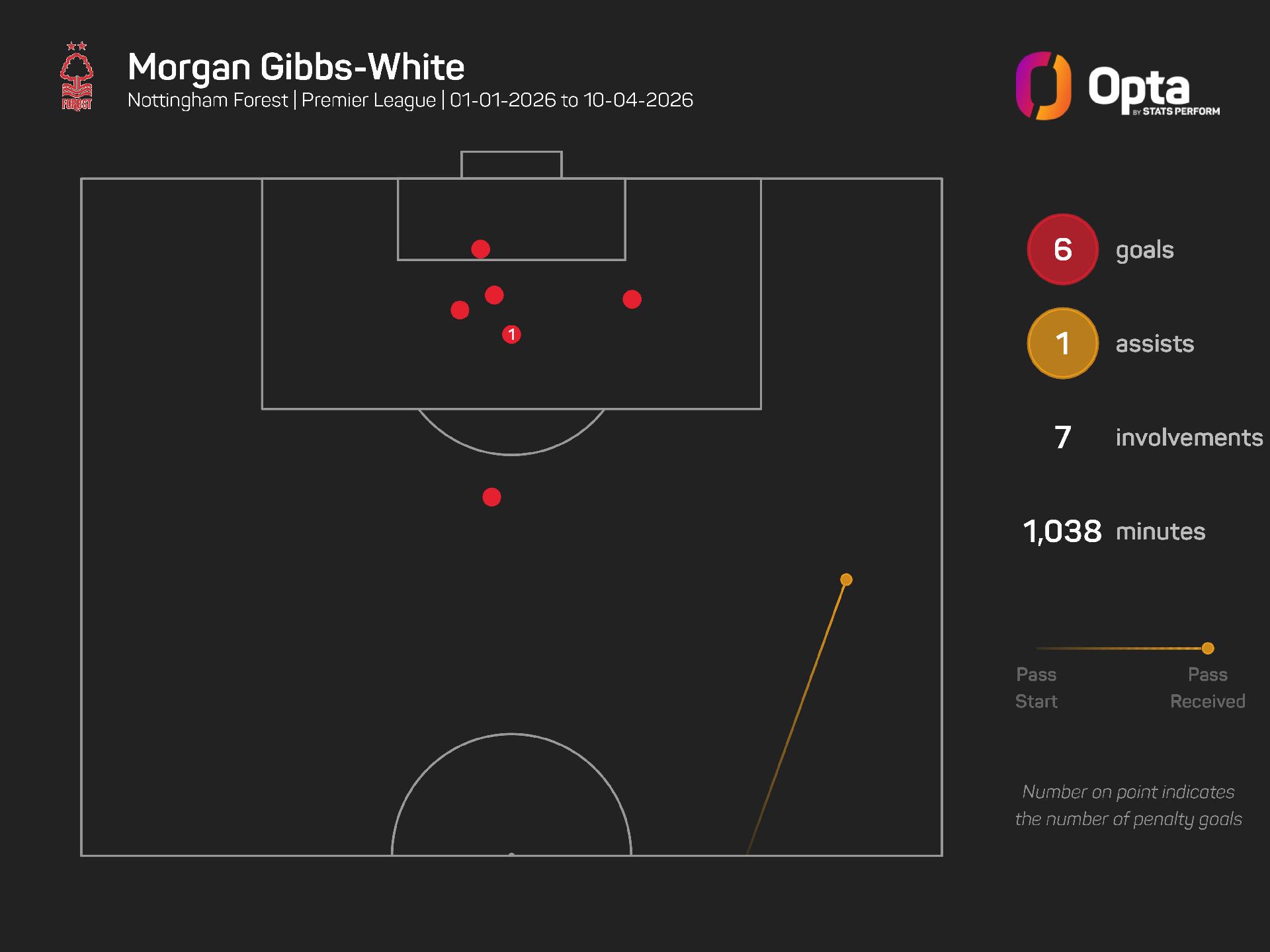 In 2026, only Bruno Fernandes (12), Joao Pedro (10), and Igor Thiago (eight) have more Premier League goal involvements than Gibbs-White (seven – six goals, one assist).
