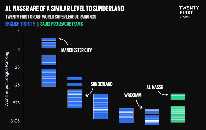 As well as determining the quality of the Saudi Pro League, Twenty First Group and Chaudhuri are able to quantify the impact Ronaldo may have for Al Nassr.