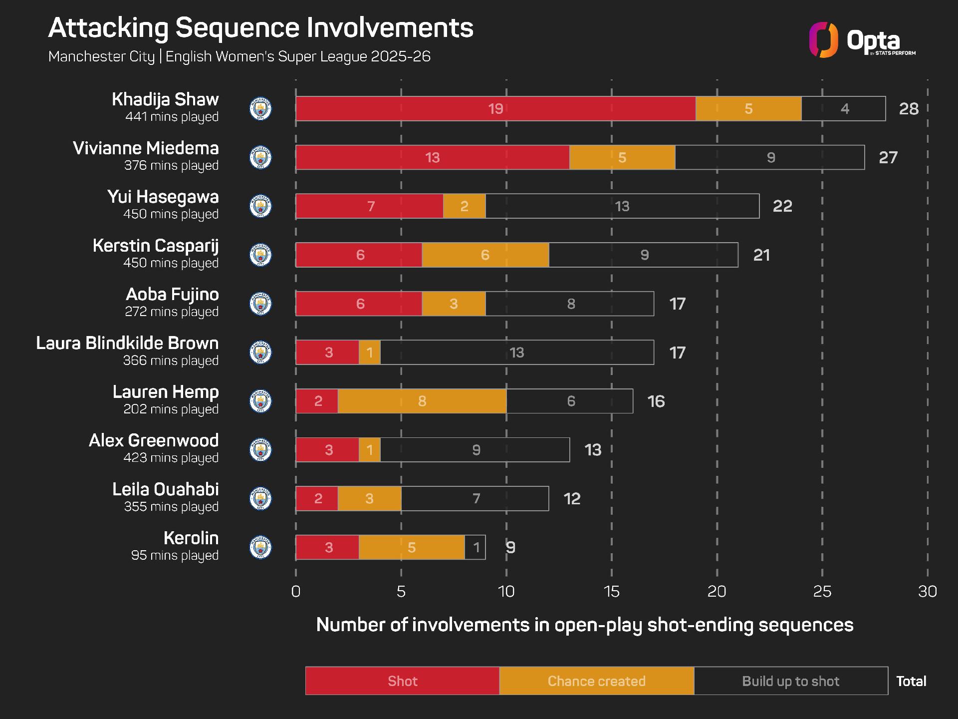 City have had the most different goalscorers in the WSL so far this season (excluding own goals), with the Citizens having nine scorers at this stage of a season for the first time since 2017-18 (10). Jeglertz's team have had more scorers than eight of the other 11 teams have scored goals.