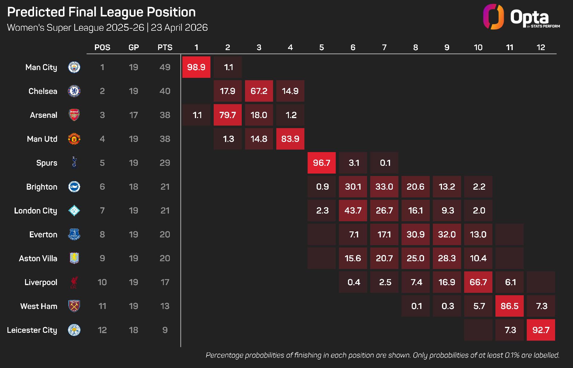 The Foxes are assigned a 7.3% chance of retaining their top-flight status as they find themselves four points off West Ham in the table, and could follow the men's team in dropping a division in what has been a dismal season for the club.