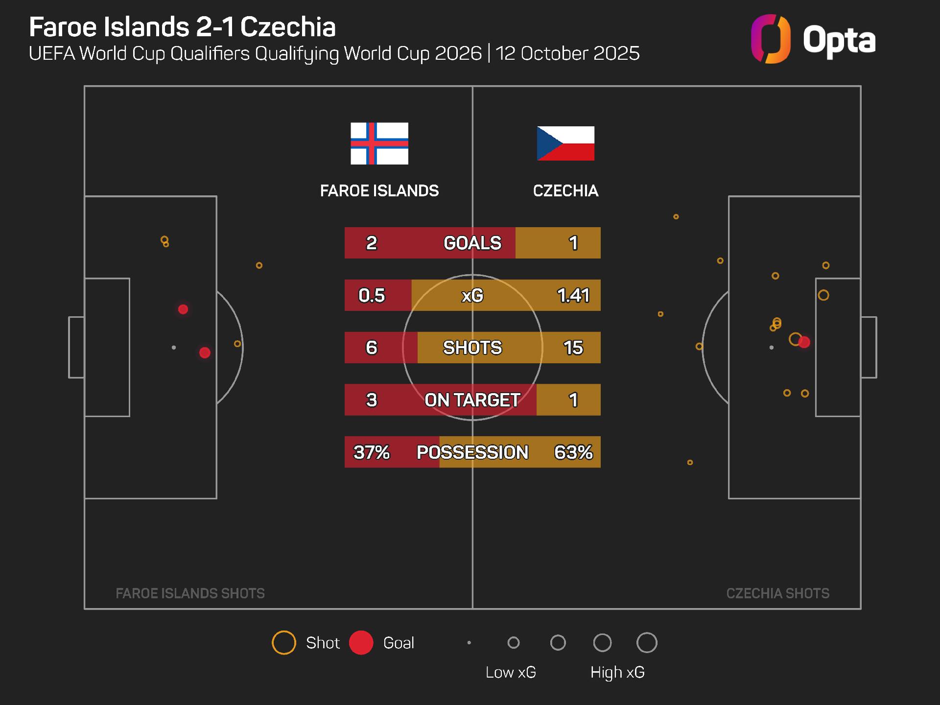 The Faroe Islands are ranked 136th in the world but are now just one point behind Czechia in Group L, keeping their hopes of at least reaching the play-offs alive.