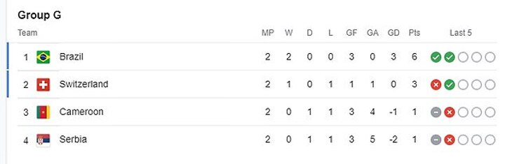 Currently in pole position to join Brazil are Switzerland in second. A win over Serbia on Friday will see them progress to the last 16. A draw could also be enough, assuming Cameroon don't beat Brazil by two goals or more.