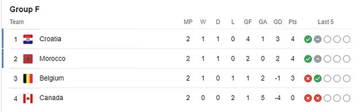 Group F: Croatia, Morocco, Belgium, Canada