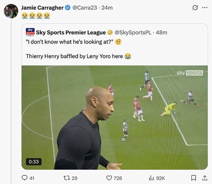 The ex-Gunners star was later attacked on social media by fans accusing him of 'uncomfortable and borderline embarrassing' criticism of his fellow Frenchman, and 'cheap, in the toilet punditry', while Carragher deleted a post where he had responded to Sky Sports' clip of the analysis with four weeping emojis.