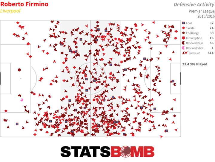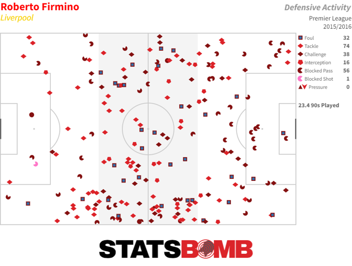 Did Roberto Firmino make 217 defensive actions in 2015/16?