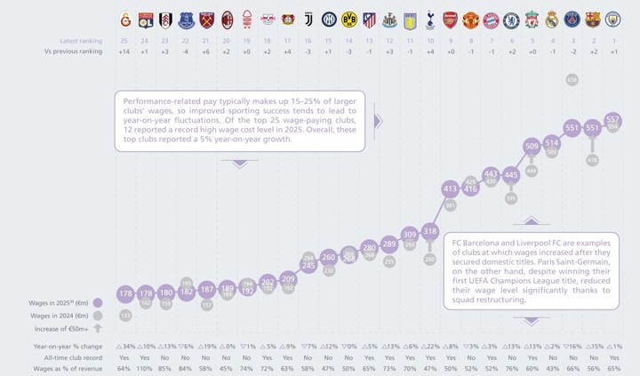 On February 26, UEFA officially released the UEFA European Club Finance and Investment Landscape report, which included the top 25 clubs in terms of wage spending.