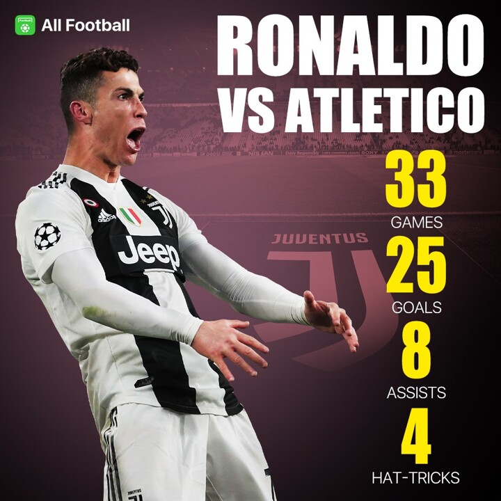 Tonight, it will be the 34th game between Cristiano Ronaldo and Atletico. In the former 33 games, CR7 has contributed 8 assists and 25 goals, including 4 hat-tricks.