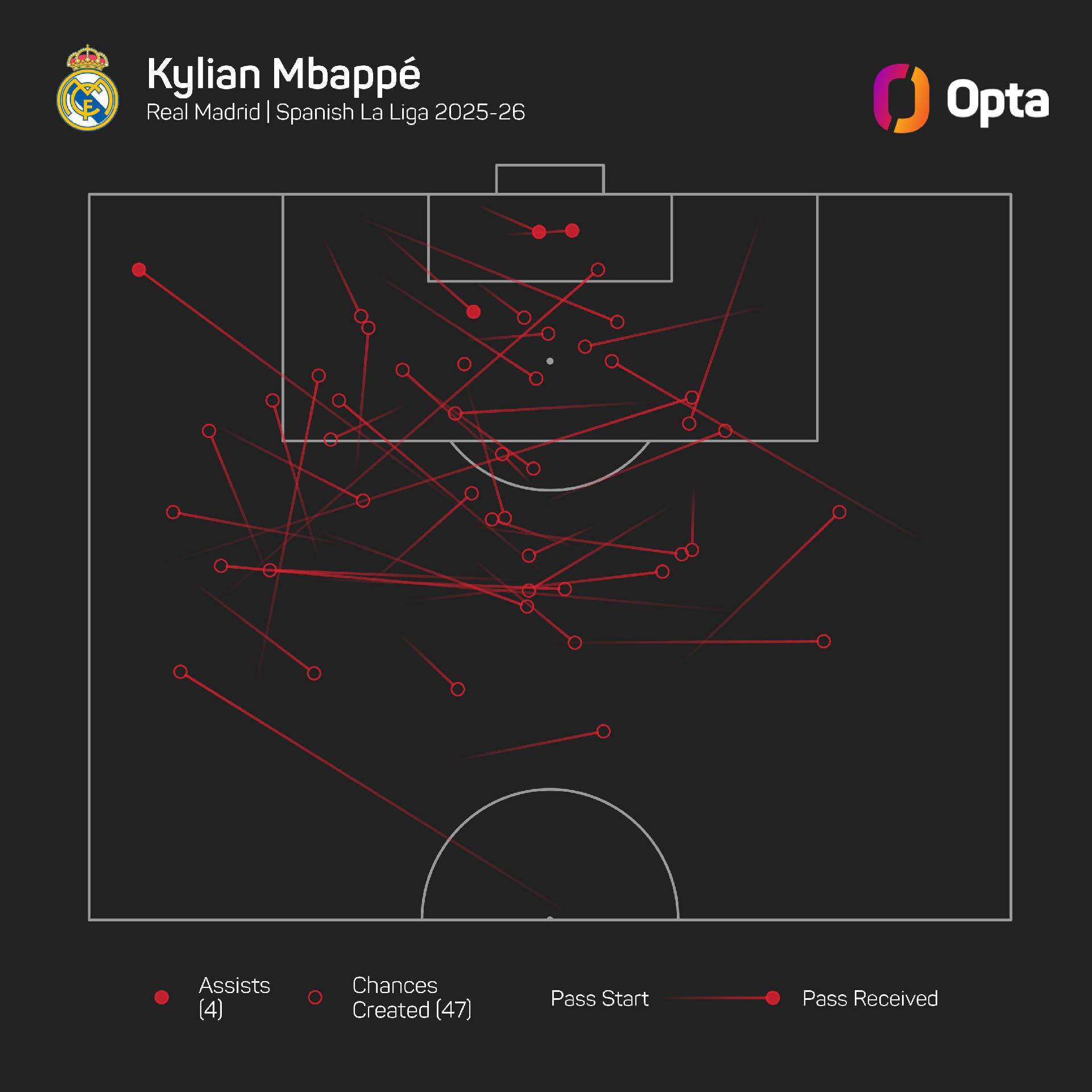 As well as being Madrid's leading scorer this campaign, netting 26 of their 45 goals in all competitions since the end of the Club World Cup, Mbappe has created 47 chances in LaLiga in 2025-26.