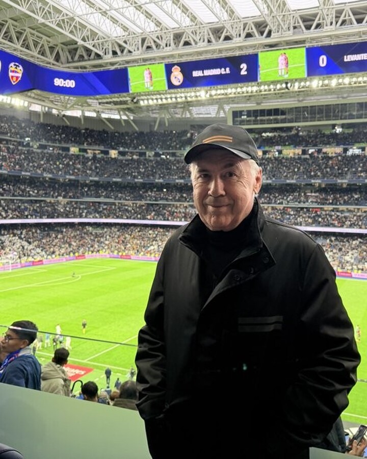 In the photo, Ancelotti stands in the stands watching the game, looking excited and clearly delighted with Real Madrid's victory. He was accompanied by the Brazilian national team director, also aiming to observe the performance of the Brazilian internationals in Real Madrid's squad.