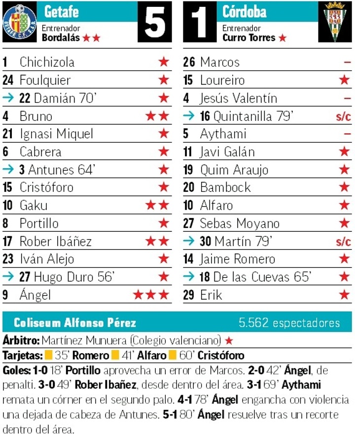 Portillo opened the scoring on 18, and though it would take until the 42nd minute for Getafe to double their lead thanks to Angel's penalty, Cordoba rarely threatened.