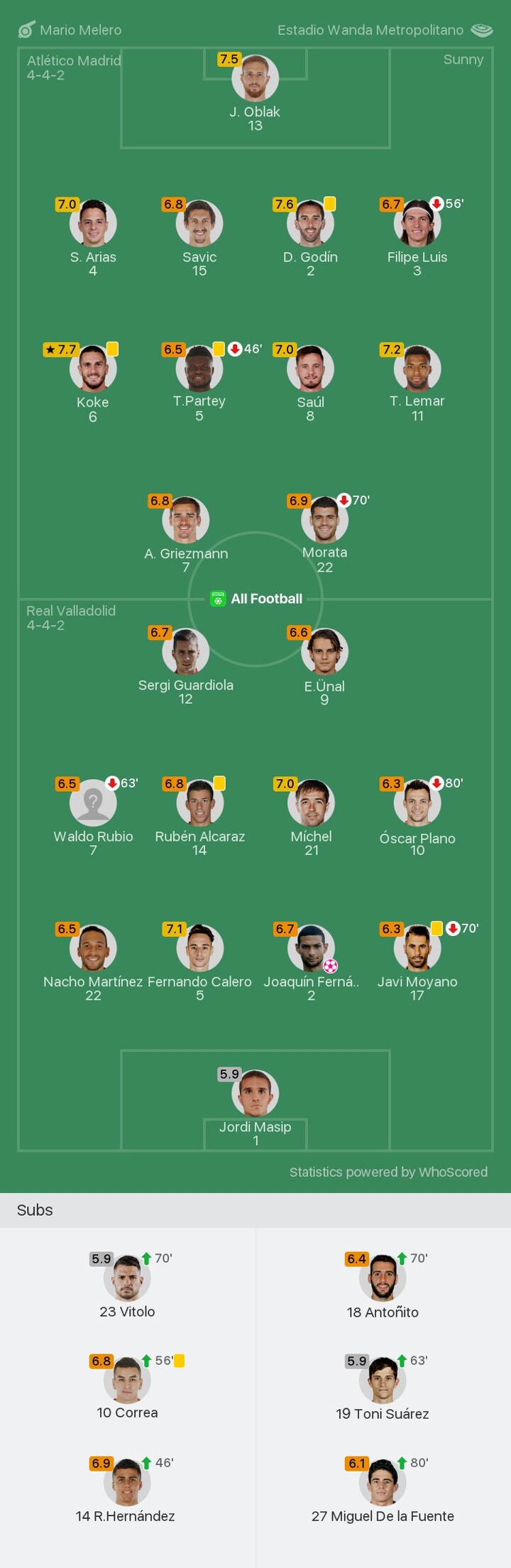 We bring you the player ratings for Atlético Madrid vs Real Valladolid as Koke becomes Man of the Match with a rating of 7.7.