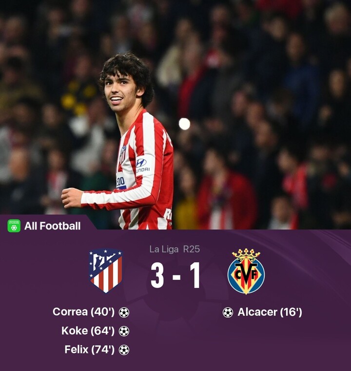 Joao Felix marked his return from injury with a goal as Atletico Madrid secured a 3-1 home win over Villarreal on Sunday.