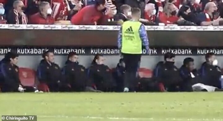 But he suffered the ignominy of trudging back to the dugout in his training bib - bringing a chuckle out of Welshman Bale sitting on the bench in front of him.