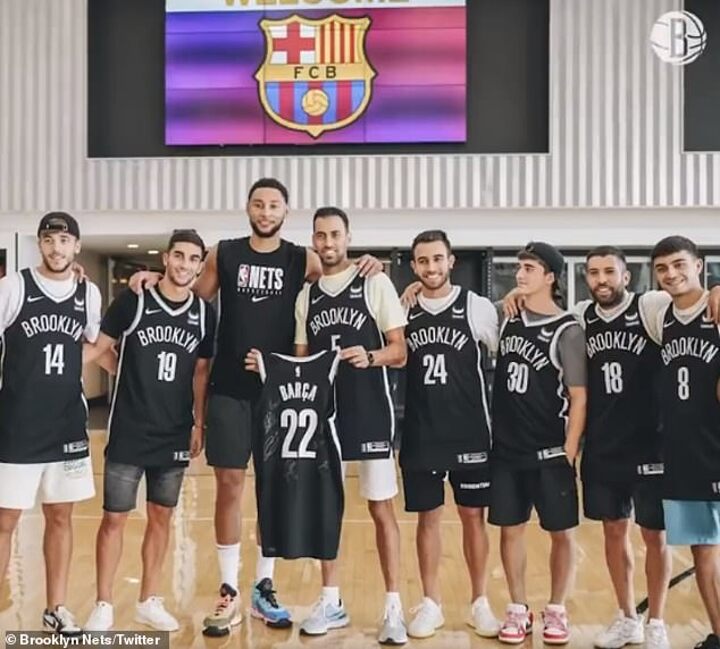 La Blaugrana's Pedri, Jordi Alba, Sergio Busquets, Nico, Gavi, Ferran Torres and Eric Garcia visited Brooklyn's training center, receiving custom jerseys before dribbling with a less familiar ball.