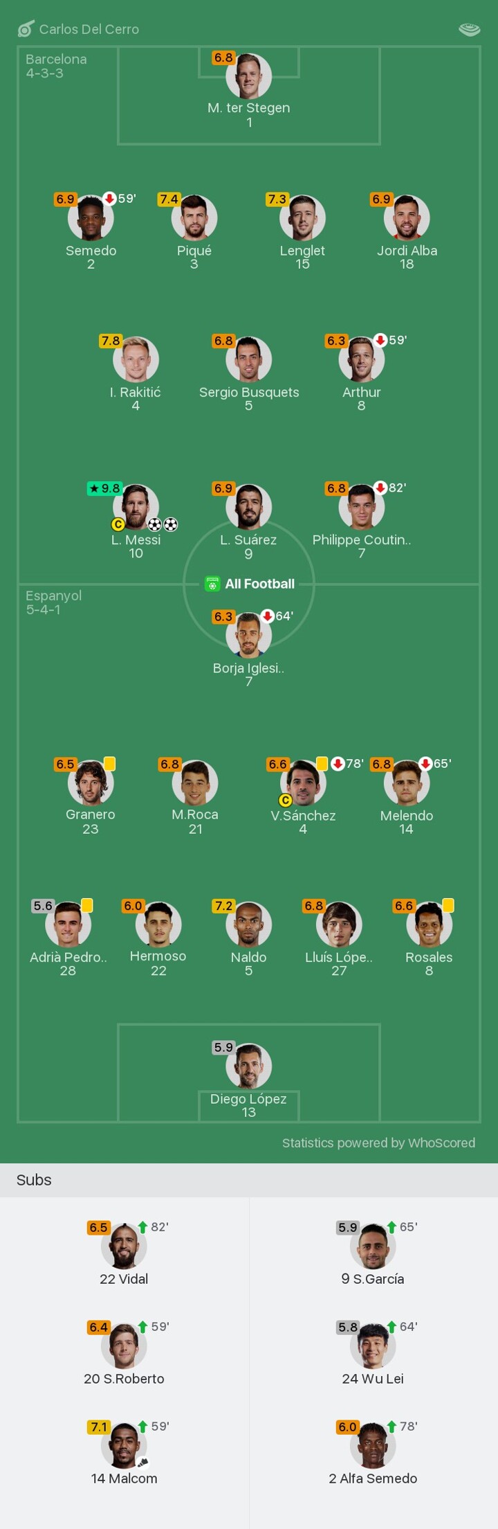 We bring you the player ratings for Barcelona vs Espanyol as L. Messi becomes Man of the Match with a rating of 9.8.