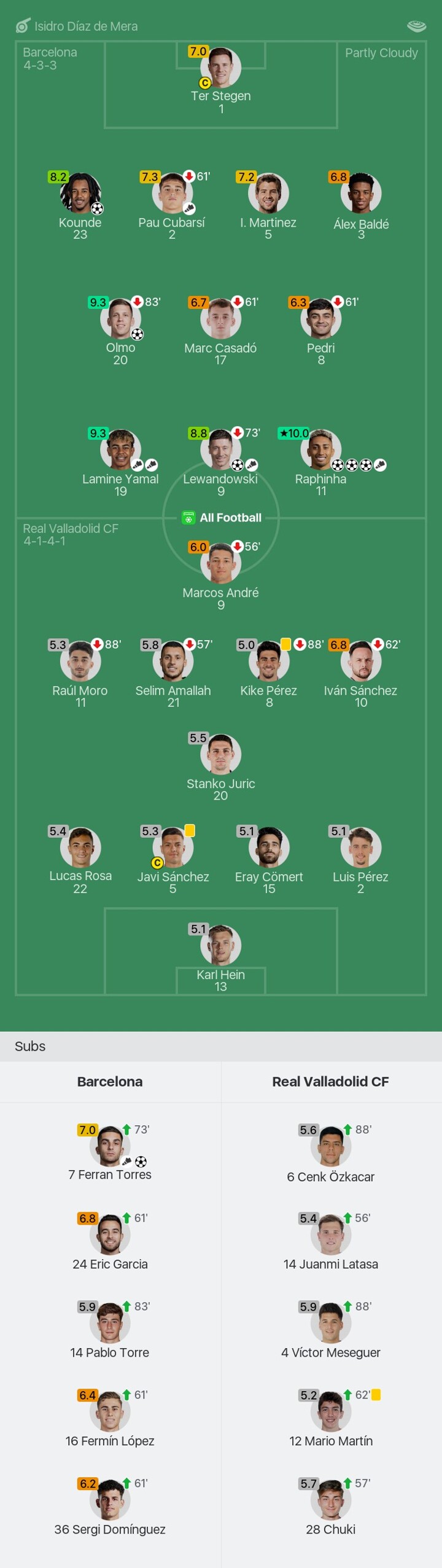 We bring you the player ratings for Barcelona vs Real Valladolid CF as Raphinha becomes Man of the Match with a rating of 10.0.
