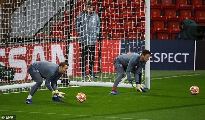 Global football stars Robert Lewandowski and Manuel Neuer were put through their paces at Liverpool's home ground as the Bundesliga club settled into their surroundings before Tuesday night's game