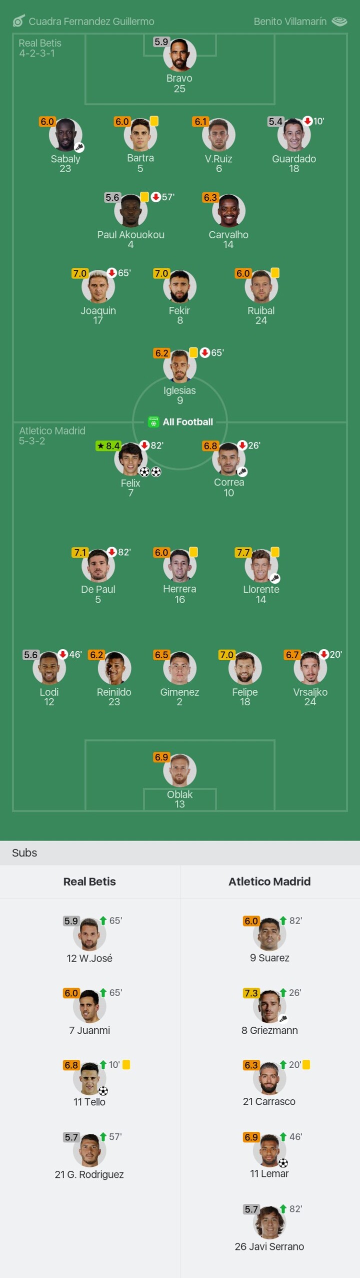 We bring you the player ratings for Real Betis vs Atletico Madrid as Felix becomes Man of the Match with a rating of 8.4.