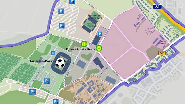 Located to the west of the city, the Borussia Park complex houses the stadium, training grounds and administrative buildings. The easiest way to get to the Borussia Park on a Bundesliga Matchday is via shuttle bus: line 017 runs from Mönchengladbach HBF to the stadium in around 15 minutes. That service is well signposted inside the station and available from three hours before kick-off until two hours after full-time. From Rheydt HBF, there's a shuttle bus that departs for the Borussia Park every five minutes – you can pick that up from opposite platform four on a Bundesliga Matchday.