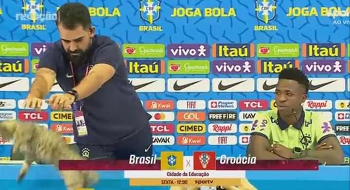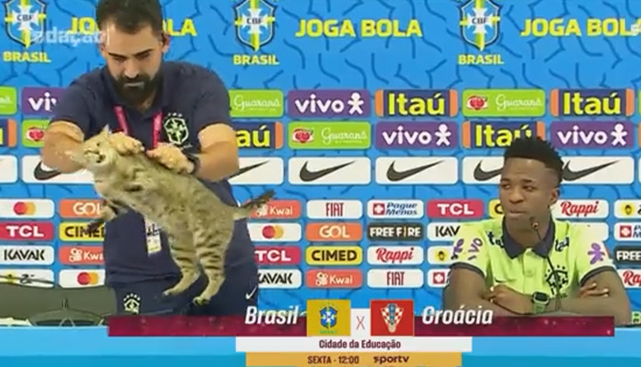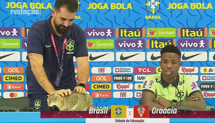 Vinicius was answering questions to the press when a cat jumped up onto the table.