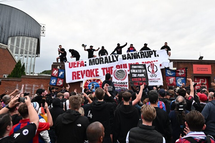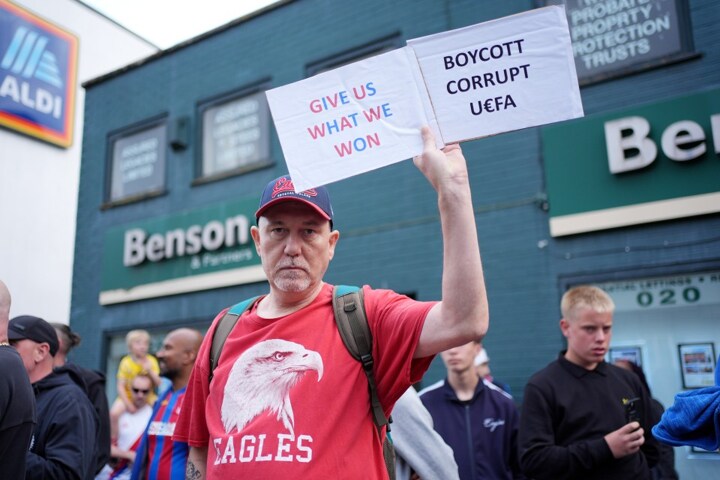 Angry supporters marched towards Selhurst Park and held a banner which read: “UEFA: Morally bankrupt. Revoke the ruling now”.
