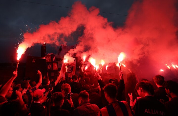 Fans could be seen climbing on top of walls as anti Uefa chants were sung and flares were let off.