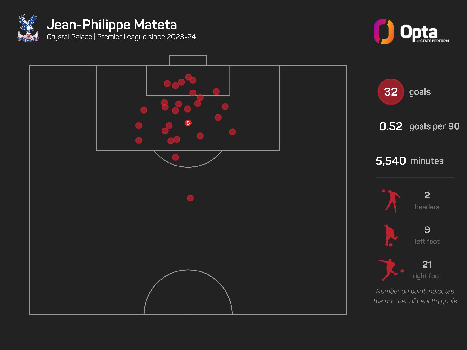 Indeed, since the start of the 2023-24 campaign, only Ollie Watkins, Chris Wood (both 36), Cole Palmer (38), Alexander Isak (44), Mohamed Salah (49) and Erling Haaland (58) have netted more times in the top-flight than Mateta (32, level with Jarrod Bowen).