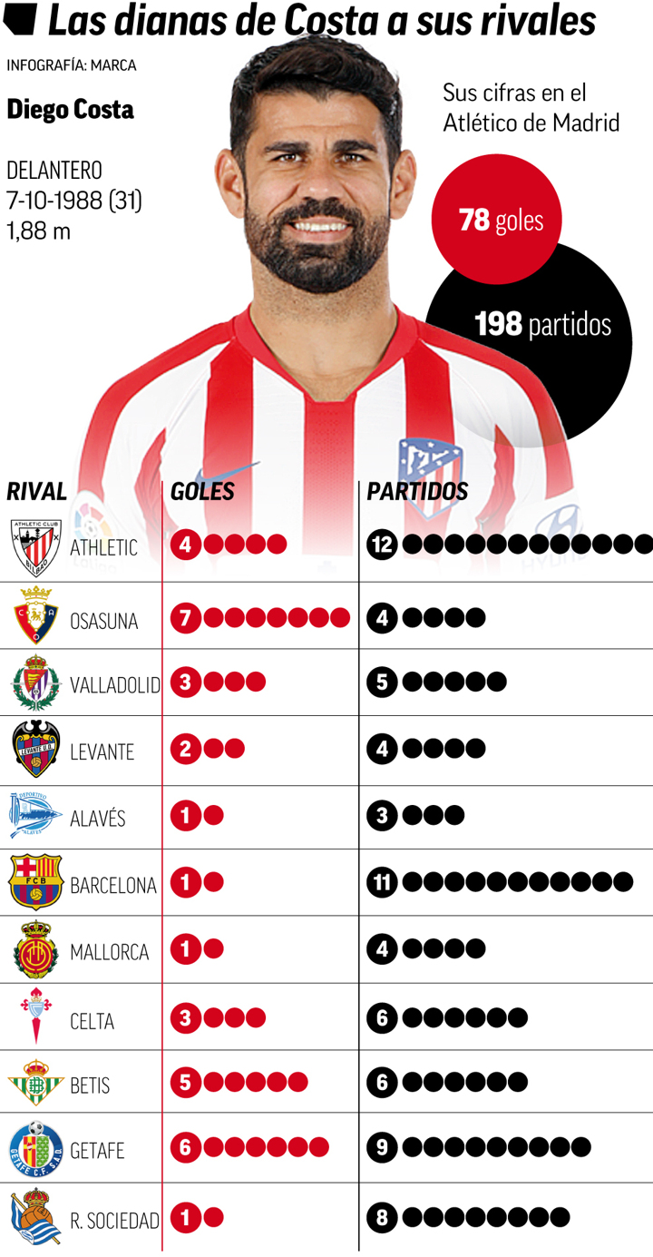 Atletico Madrid have one aim for the remaining 11 matches of the 2019/20 season and that is to qualify for the Champions League, one way or another, and they can take confidence from the fact that Diego Costa has a history of scoring against each of the 11 teams awaiting Los Colchoneros.