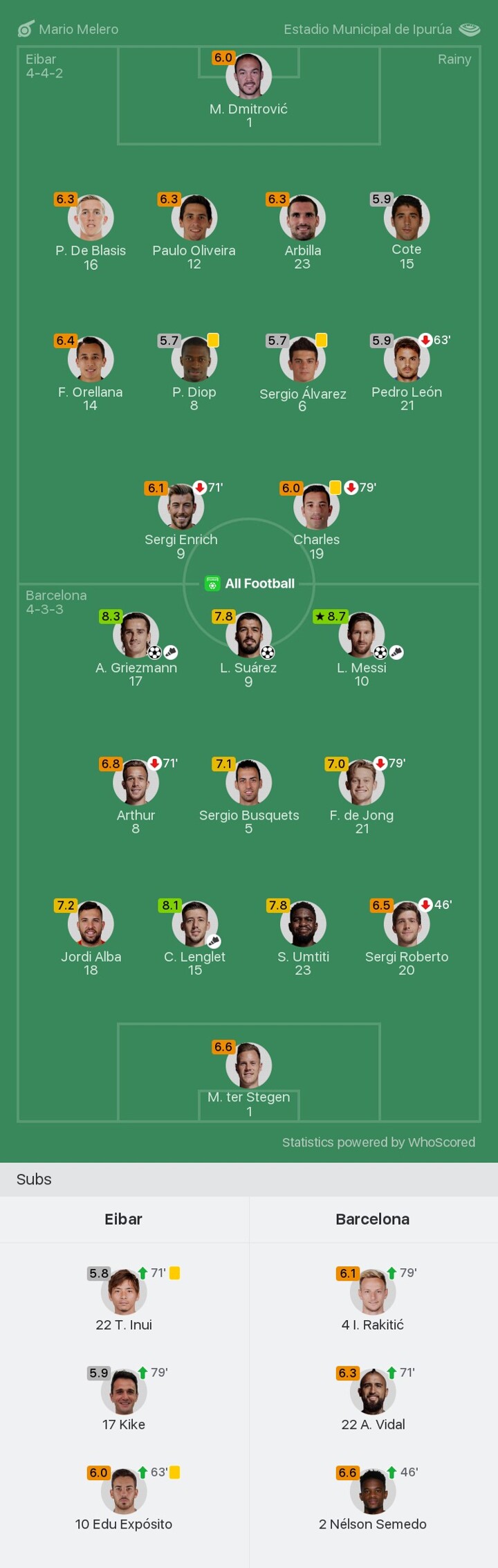We bring you the player ratings for Eibar vs Barcelona as L. Messi becomes Man of the Match with a rating of 8.7.