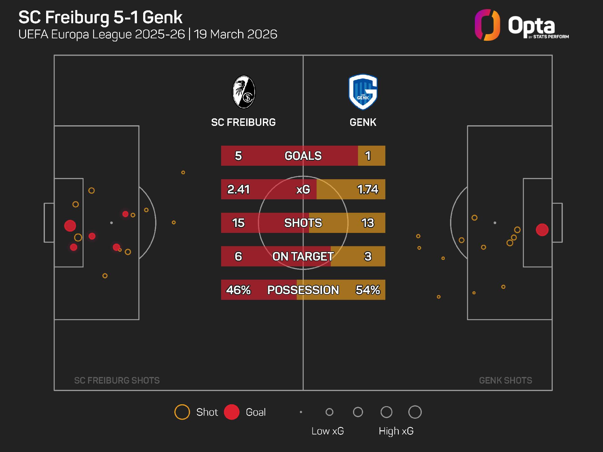 And Freiburg were worthy of their win, having registered an expected goals (xG) total of 2.41 from their 15 shots, six of which were on target, compared to Genk's 1.74 from their 13 attempts.