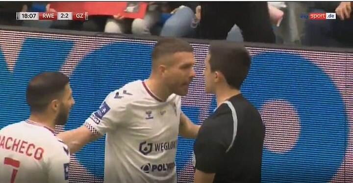 Podolski's side, Górnik Zabrze, played the rest of the match with one player less than their opponents and it proved costly as Rot-Weiss Essen scored moment's later.