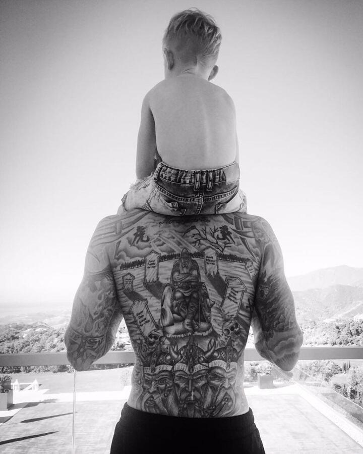 There's the Viking graveyard across his back, the love hearts on his calves, Latin proverbs all over his body and the names of his family members etched in.